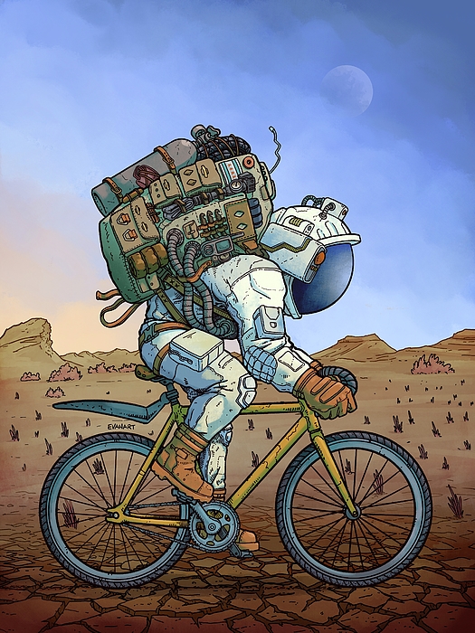 An astronaut with a large backpack is seen cycling across a barren desert landscape. The setting sun casts warm hues, and the moon is visible in the... more