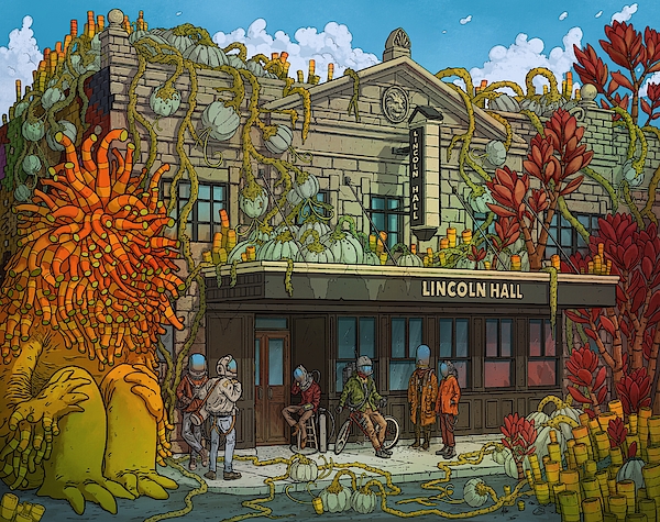 A building, labeled Lincoln Hall, is overtaken by unusual and colorful alien-like plants. The scene includes several humanoid figures around the... more
