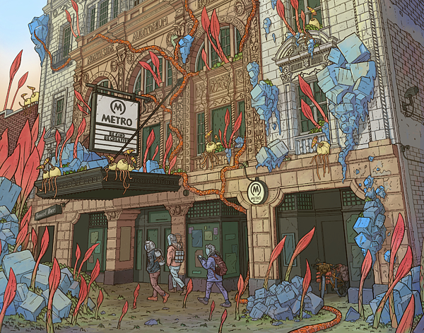 Urban architecture is intertwined with vibrant plants and blue crystals. Adventurers explore the transformed cityscape, blending nature and fantasy.