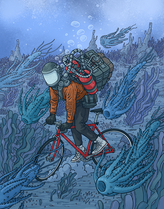 A surreal scene depicts a person in a spacesuit riding a bicycle underwater, surrounded by aquatic vegetation and vibrant marine life. The colorful... more